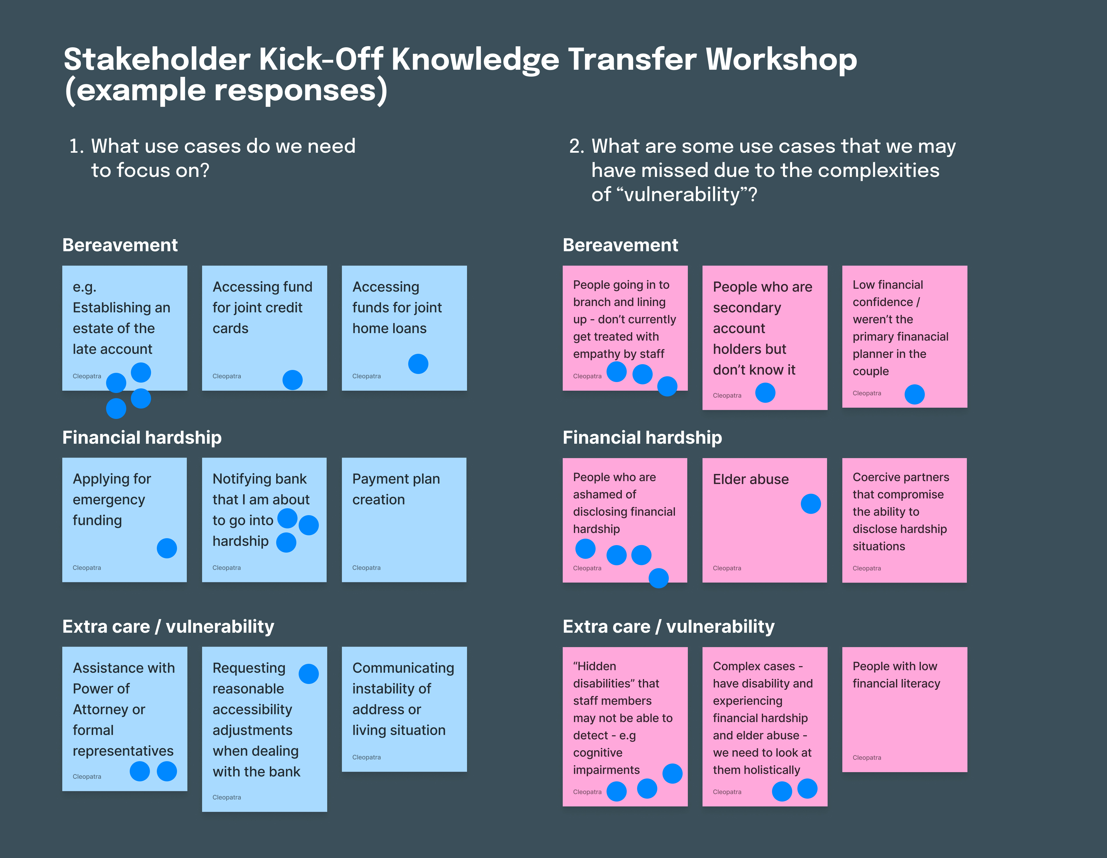 I spearheaded and conducted custom workshops to collaboratively uncover current state use cases, systems, requirements, teams, processes, key stakeholders, assumptions, legislation and stakeholder success metrics to inform our primary and secondary research focus.